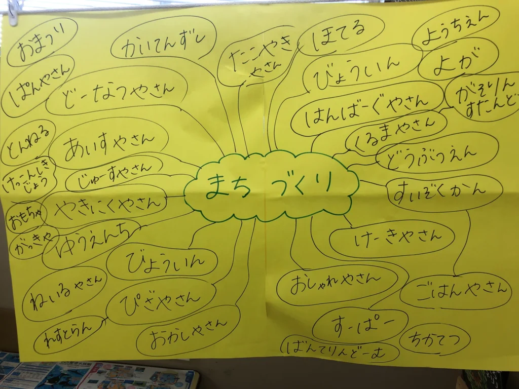 プロジェクトは、子どもたちが「自分たちのまちをつくってみたい!」という思いを自由に話し合うことから始まりました。「パンやさん」「すいぞくかん」など、夢あふれるアイデアがたくさん集まります。