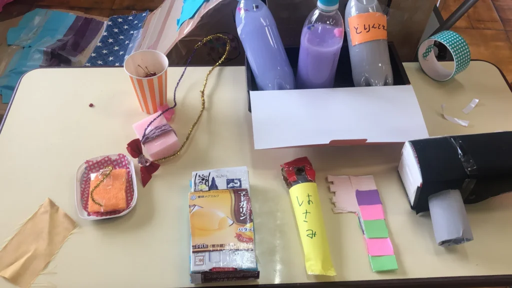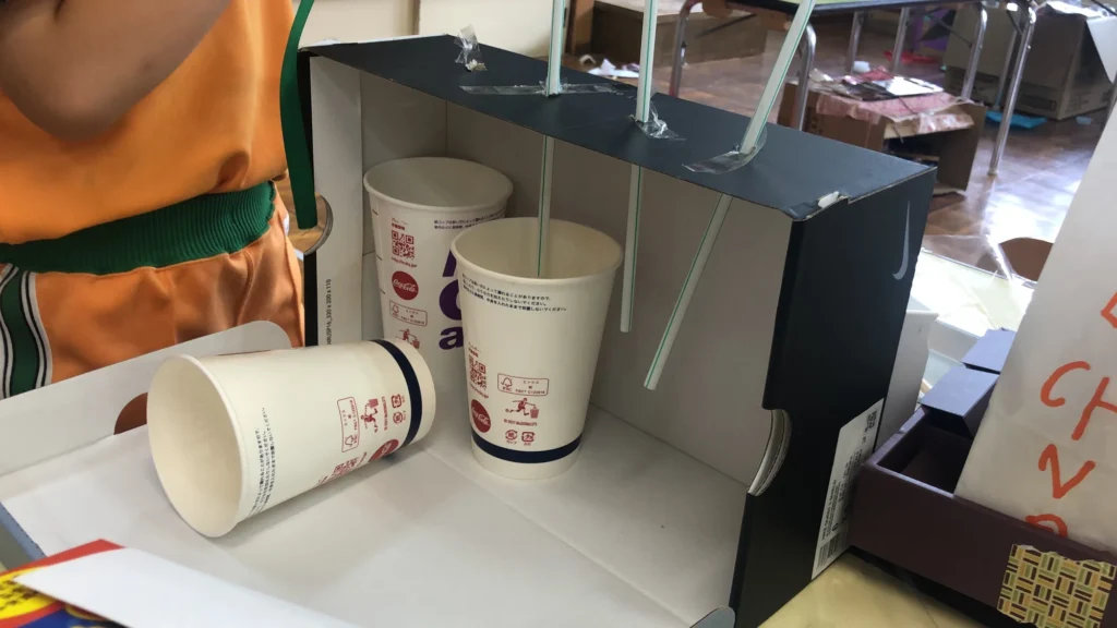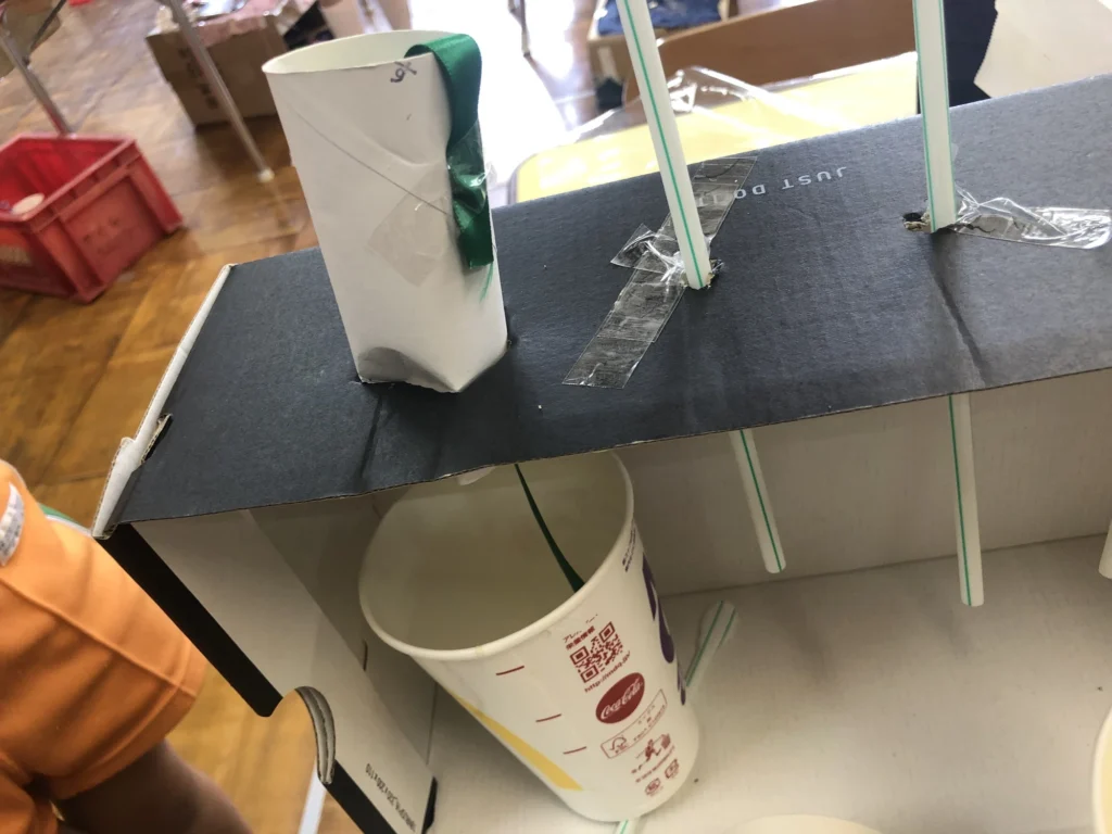 ・「まっくやさん」チームでは、ジュースを出すドリンクマシンがうまく作動しないという課題に直面しました。保育者からの「トイレットペーパーの芯を使ってみたらどうかな?」というヒントを元に、子どもたちは何度も試行錯誤を重ね、ついに自分たちの力で改良を成功させます。