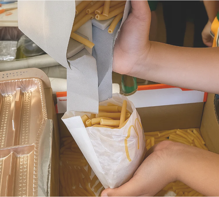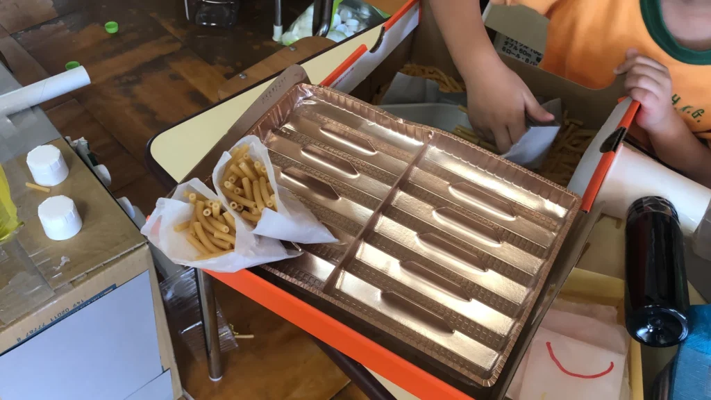 さらに、子どもたちが頭を悩ませたのが「ポテトの入れ方」です。お店の人のように、素早くきれいに袋に入れるにはどうすれば良いか。保育者と一緒に考え、たどり着いた答えが、「マカロニ」をポテトに見立て、「小さなチリトリ」を使って入れるという独創的な方法でした。何度も繰り返し「ポテト」を袋に入れることを楽しむことで、自信を持ってオープンの日を迎えます。後日の保育参観では、お店に長い行列ができた際も、子どもたちは慌てることなく丁寧に自分の役割をやり遂げていました。