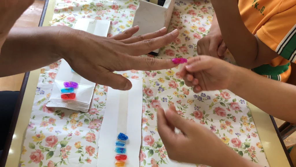 「おしゃれやさん」では、ネイリスト役の園児が「どの色がいいですか?」と優しく尋ね、お客さんの好みに合わせてシールで飾りつけを施します。そこには、相手に喜んでもらいたいという、温かな「おもてなしの心」が育まれていました。
