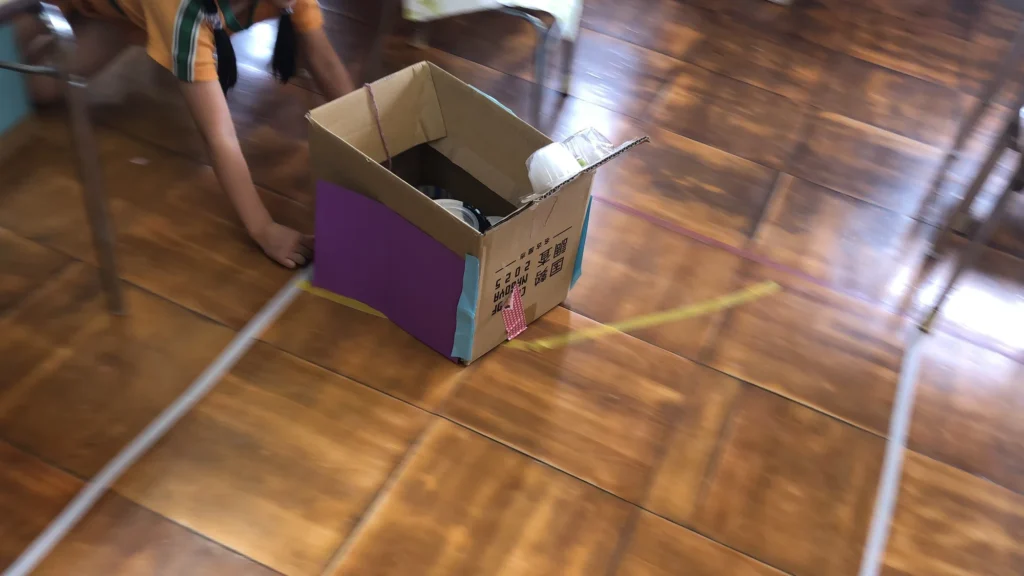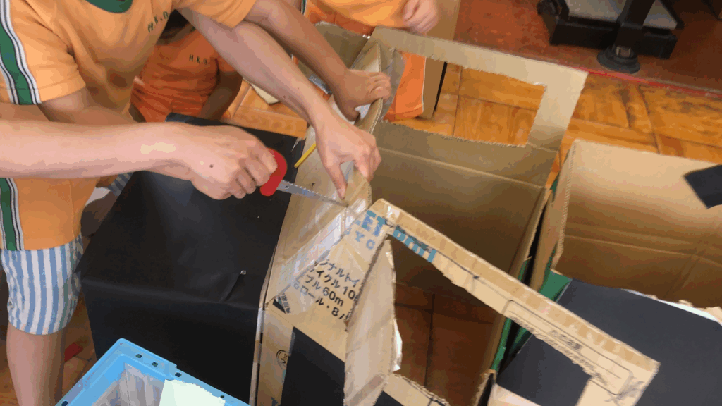 ・「くるまやさん」チームは、段ボールに大きな布を貼り、本物そっくりの車体を塗装。サイドミラーやフロントガラスなど、細部にまでこだわり、初めての段ボールカッターにも挑戦しました。