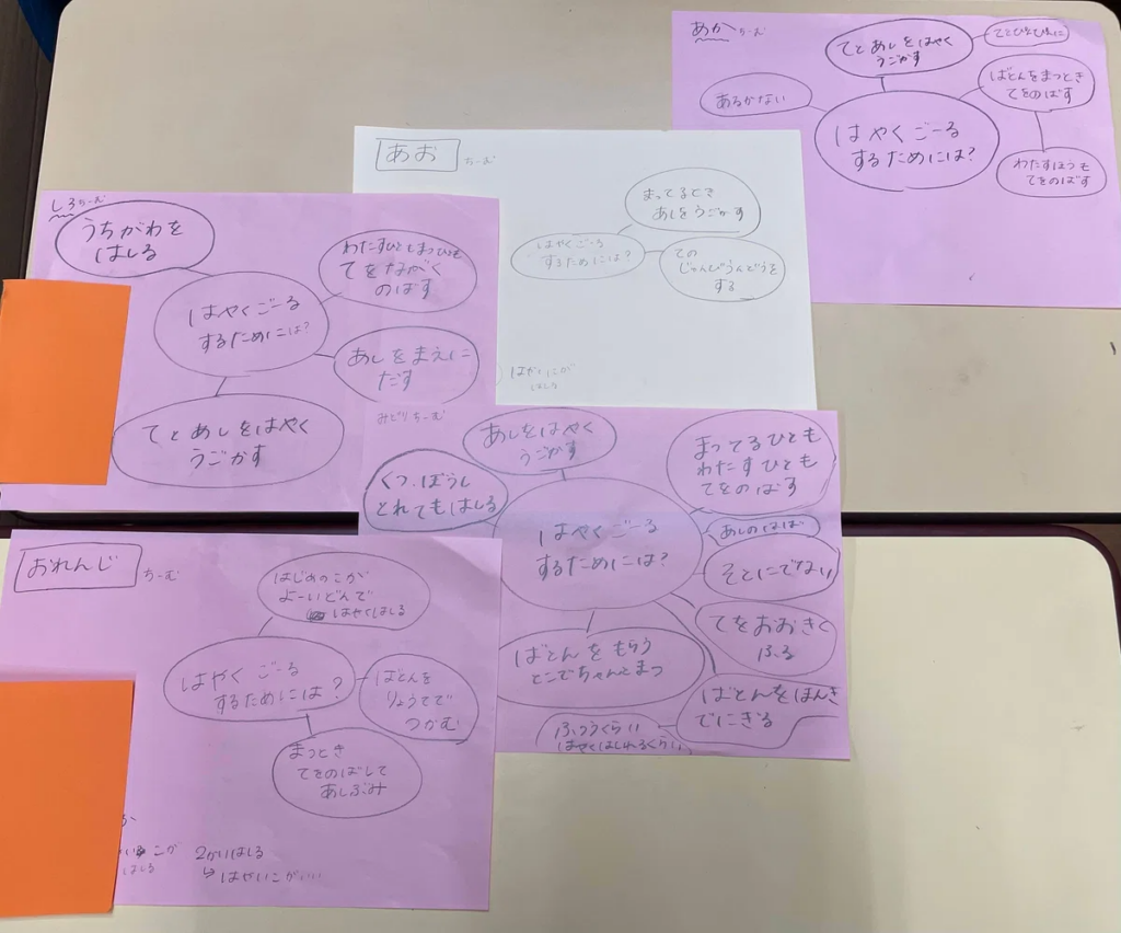 チームごとの「作戦会議」では、子どもたちが意見を出し合いました。「内側を走る」「バトンを待つ時に手を伸ばす」など、アイデアを整理するためのマインドマップには、子どもたちが考え抜いた工夫がたくさん記録されています。