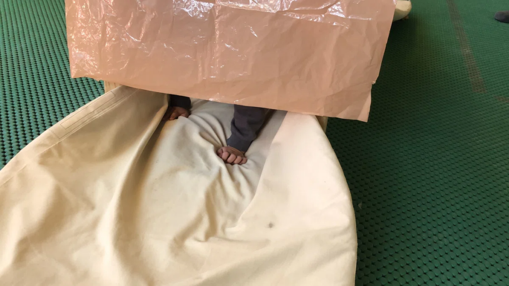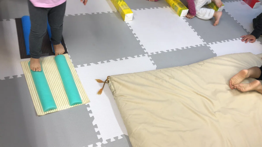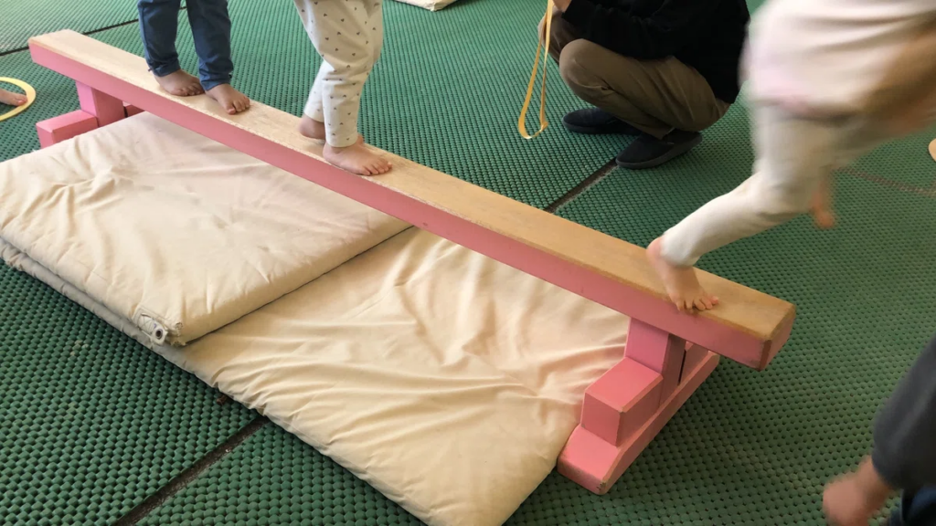 満3歳児クラスでは、平均台やマット、トンネルなどを保育室や中庭に子どもの様子に応じて設置し、子どもが自分の意志で遊びを選べる環境を整えています。
