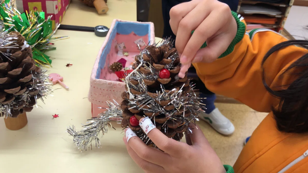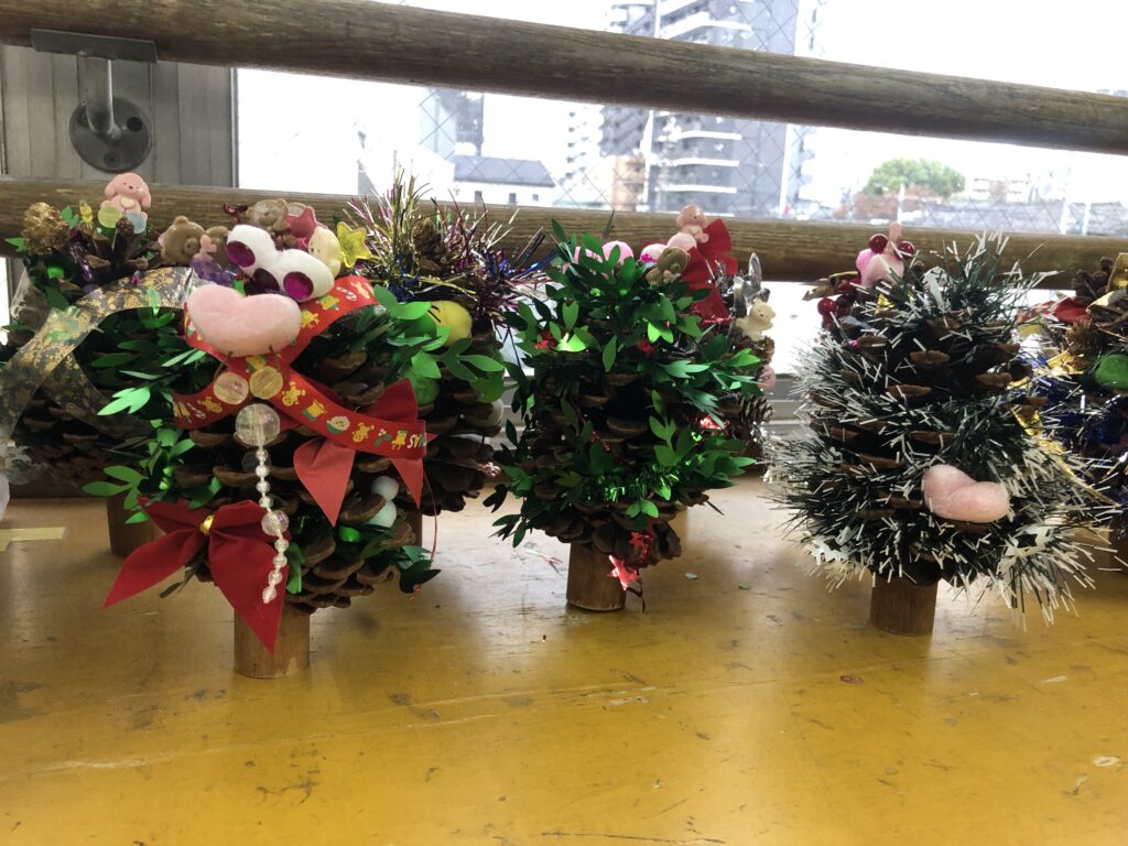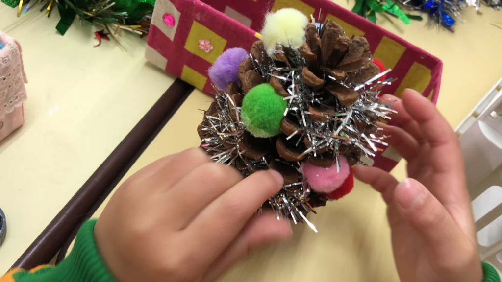 この制作は、松ぼっくりやモールなどの素材を使った別の制作遊びへとつながっていく場面もあり、素材との出会いが新しい発想を呼び込んでいました。