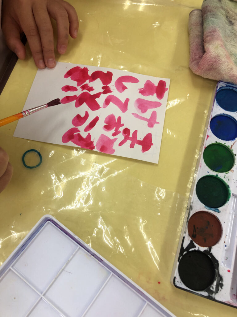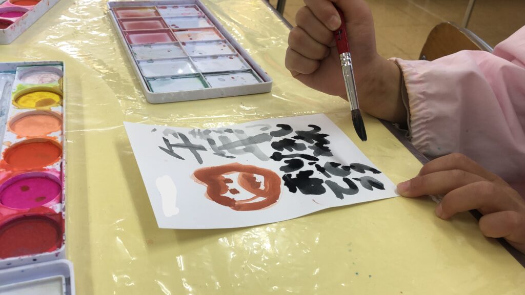机の上には、絵の具と筆、白い紙。子どもたちは、いつもの制作とは少し違うことをちゃんと感じ取っています。