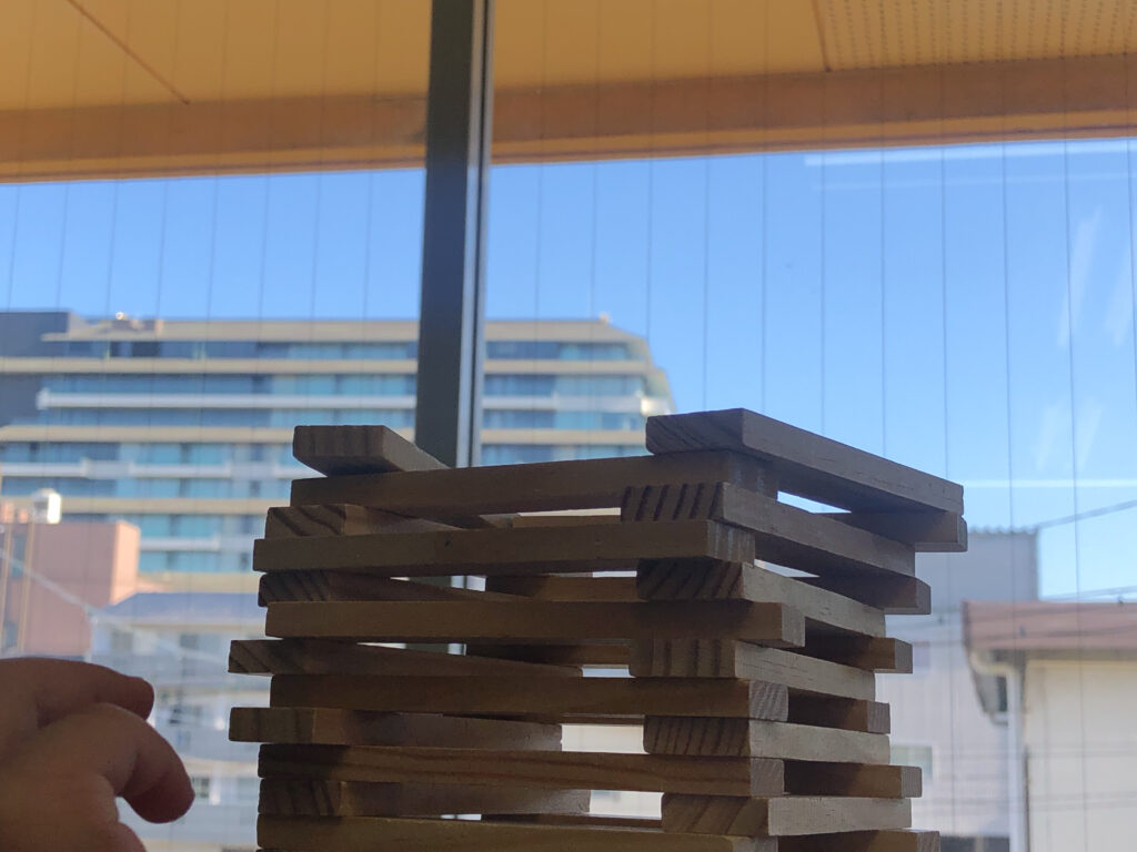遊びの中で育っていくのはタワーの高さだけではなく、「どうしたらできるかな」と考え、行動に移す力だと感じる場面でした。