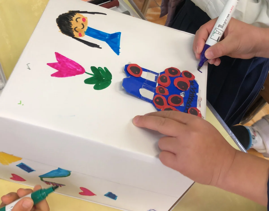 「募金箱をつくる」という行動の奥には、年長さんらしい “誰かのことを考えて行動する” という目的意識が見えてきます。