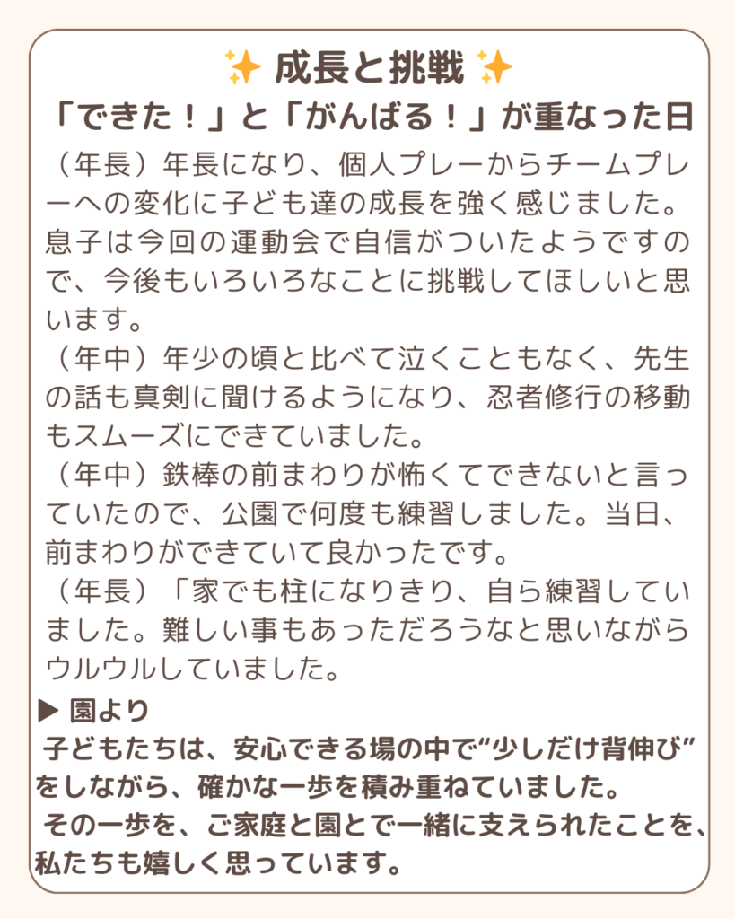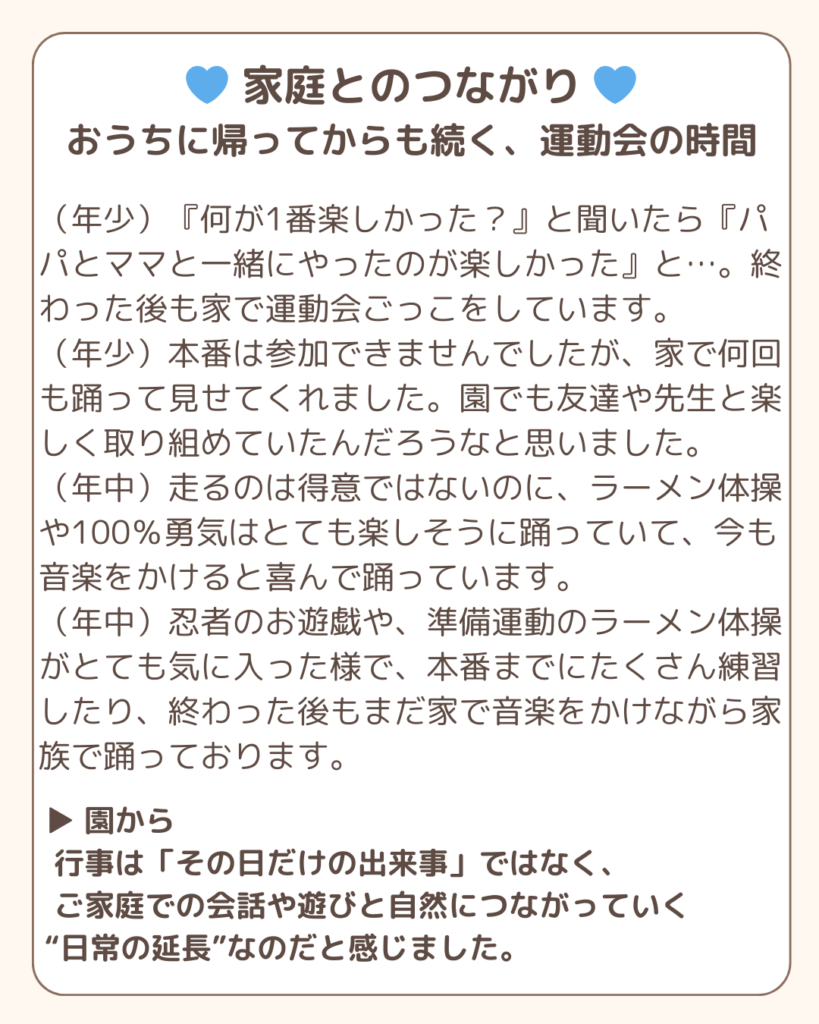運動会当日だけでなく、その前後の家庭での関わりも含めて、子どもたちの挑戦は支えられていることが伝わってきます。