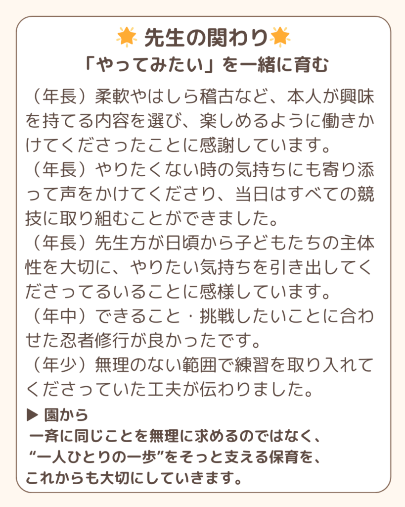(年長・保護者)やりたくない時の気持ちにも寄り添って声をかけてくださり、当日はすべての競技に取り組むことができました。