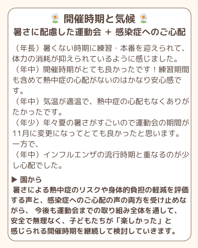 今回は、運動会後にいただいた保護者アンケートの声をもとに、運動会という一日の“その先”に続く時間まで、静かに振り返ります。