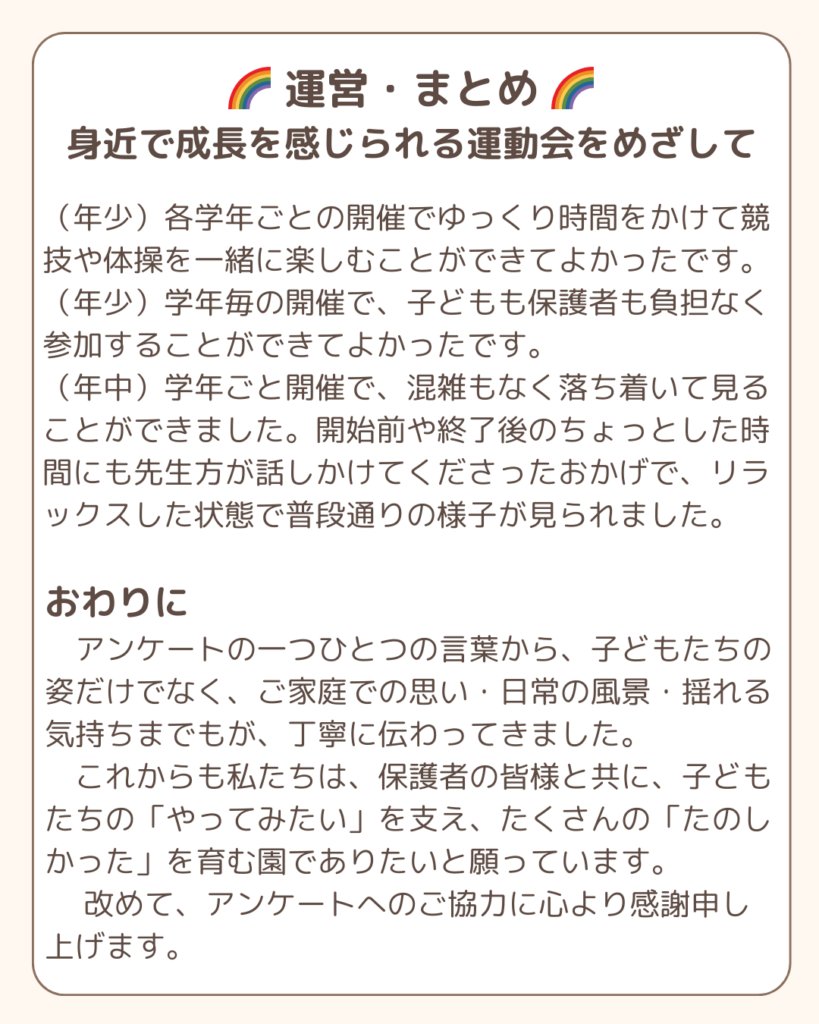 アンケートの言葉からは、家に帰ってからも、運動会の余韻が続いていたことが伝わってきました。