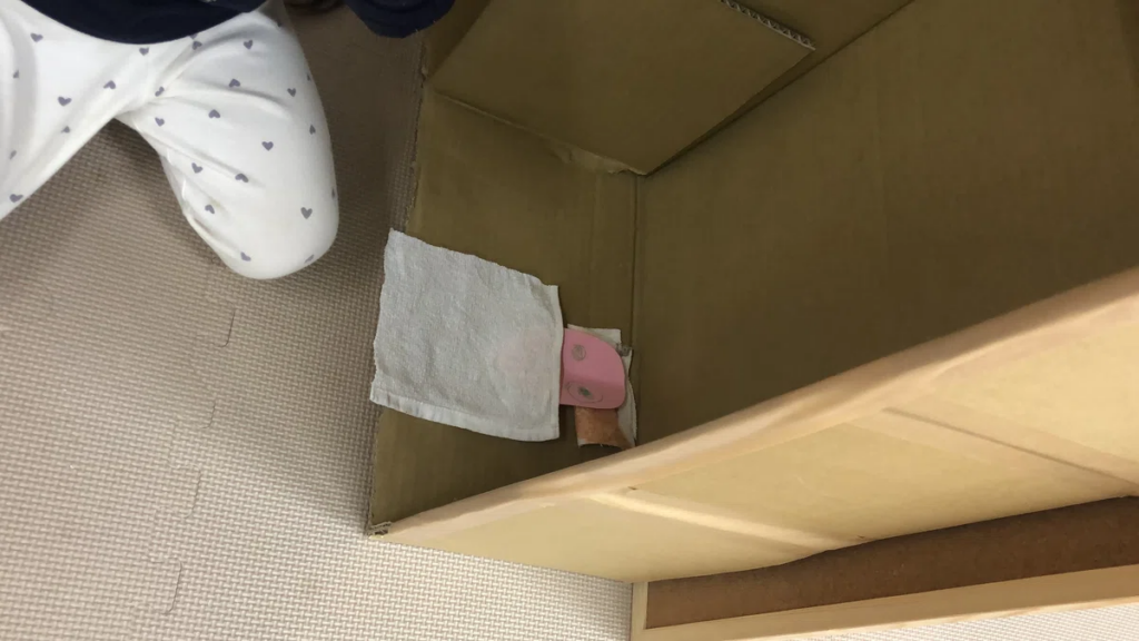 保育室の中を歩き、立ち止まり、抱えて移動する姿が見られました。