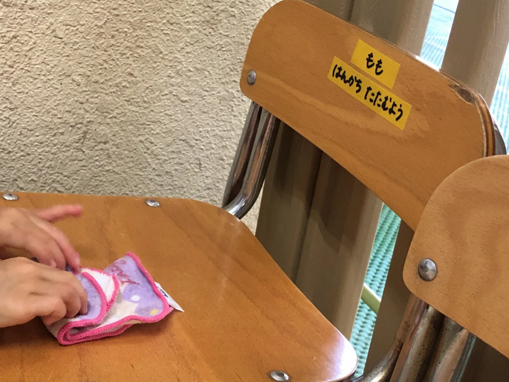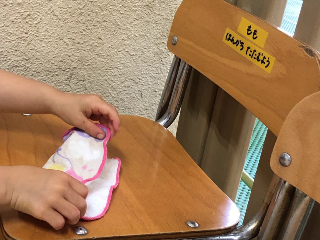 椅子の上でハンカチを広げ、そっと畳む姿。