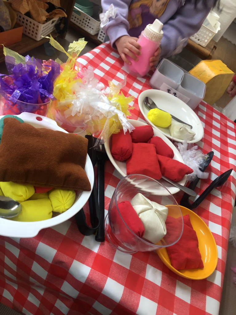 キッチンコーナーでは、いつものようにごっこ遊びが始まっていました。