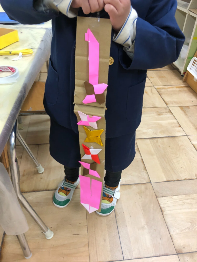 ある日の延長保育前の時間。段ボールに折り紙を貼り重ねた作品を手に、「ネクタイができたよ」と誇らしげに見せてくれた子がいました。