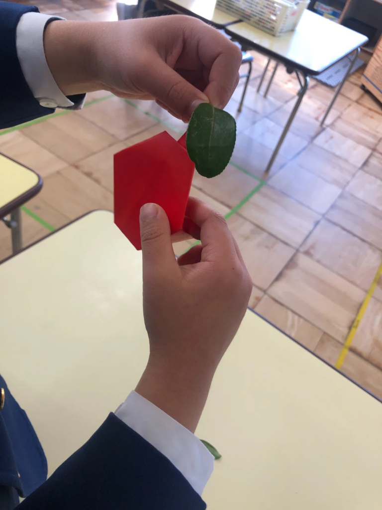 先生に折ってもらった“あかピクミン”の頭に、葉っぱをちょこんと乗せて「これ、つけるんだ」。