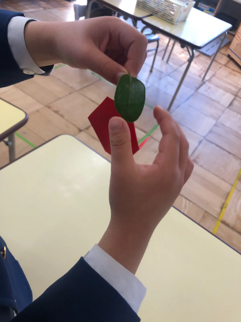 また、朝の遊びの時間には、園庭で見つけたサザンカの葉っぱを手に、「セロテープどこ?」とやってきた男の子がいました。