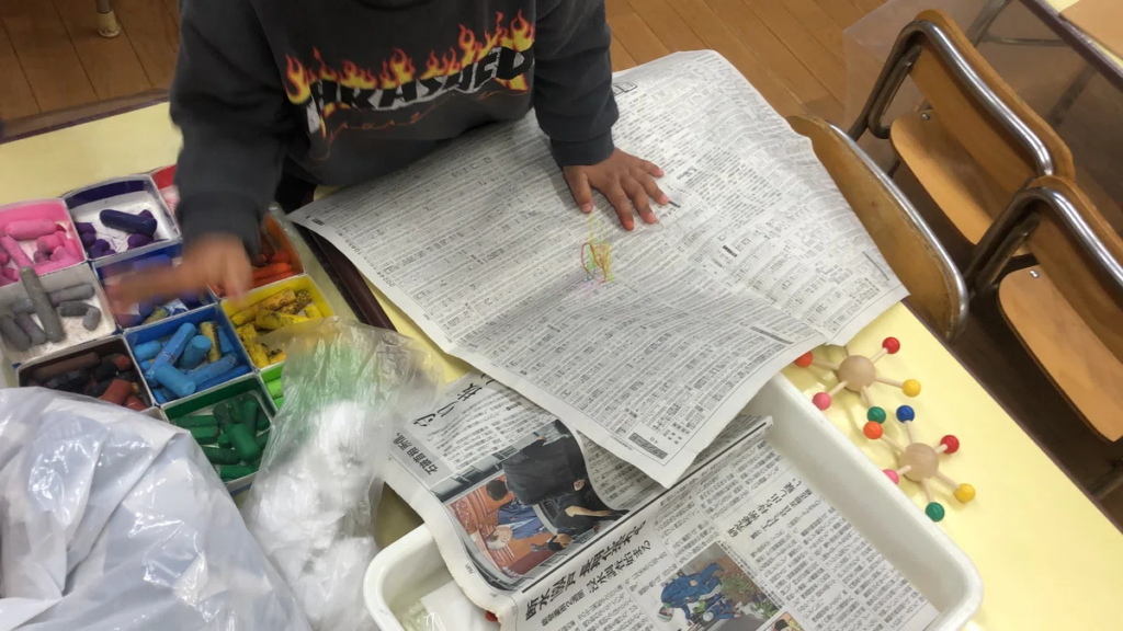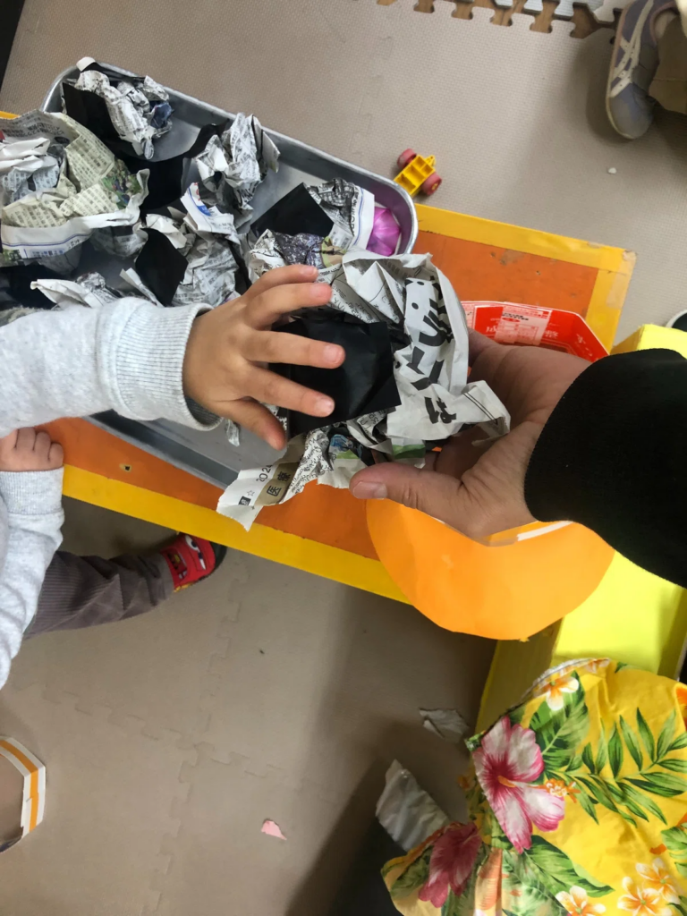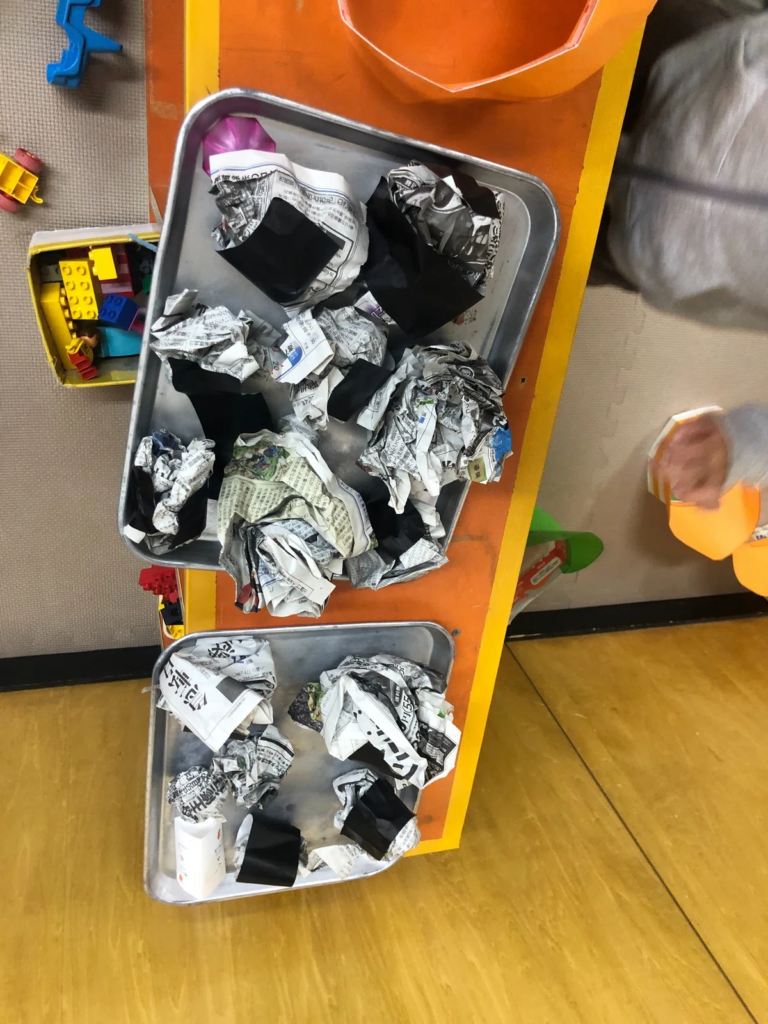 始業式の翌日、クラスで読んだ絵本をきっかけに、新聞紙を使った「おにぎり作り」が始まりました。