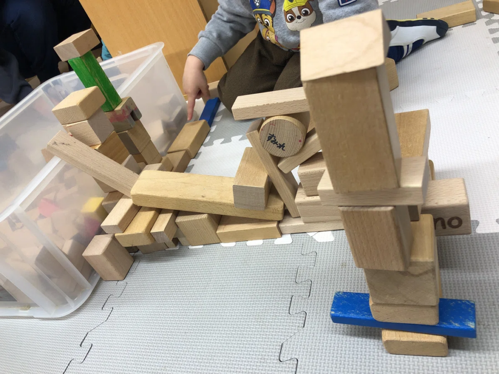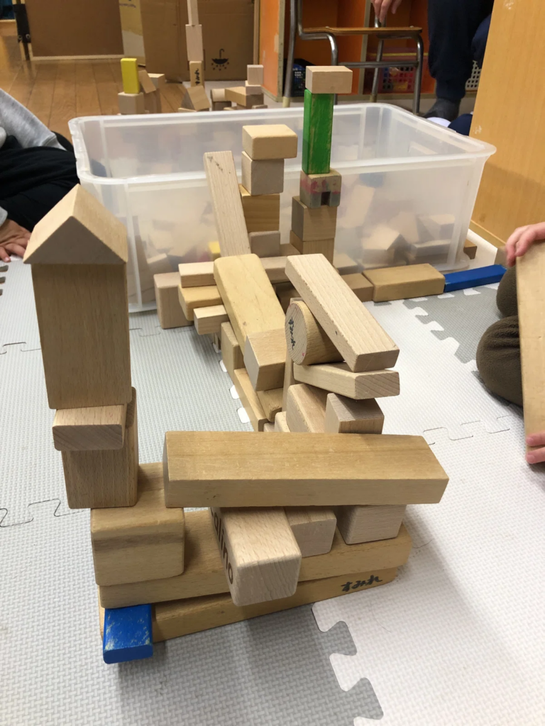 ある時、積み木を高く、あえて斜めに重ねていた男の子に、良かれと思って「ピタゴラスイッチみたいだね」と声をかけました。すると、その子は自分のイメージを「ピタゴラスイッチ」に変えて遊び始めました。
