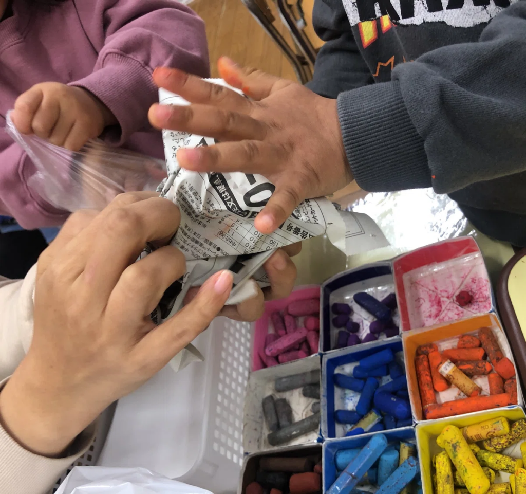 先生が握る姿を見て自然と集まってきた子どもたちは、クレヨンで具を描いたり、ビニール袋に入れたりと、思い思いに手を動かします。