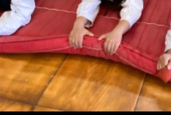 「おいしいね!」と五感で秋の恵みを感じた子どもたち。その興奮は、すぐにお部屋での遊びへと変化していきました。 マットを畑に見立てて、今度は自分たちが「お芋」に変身です。 保育者に足を引っ張られても抜けないように、全身に力を入れて踏ん張ります。
