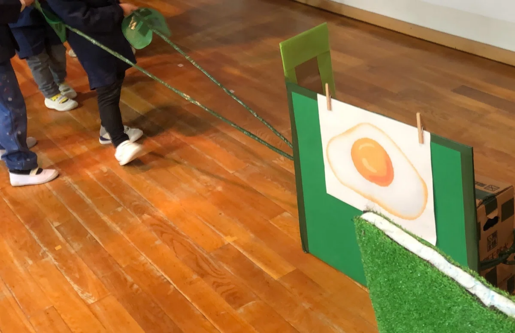 今年の年少組の劇遊びには、決まったセリフや厳しい練習はありません。 日々の生活の中で心が動いた瞬間をつなぎ合わせ、子どもたちと保育者が一緒に作り上げた、世界にひとつだけのストーリーです。