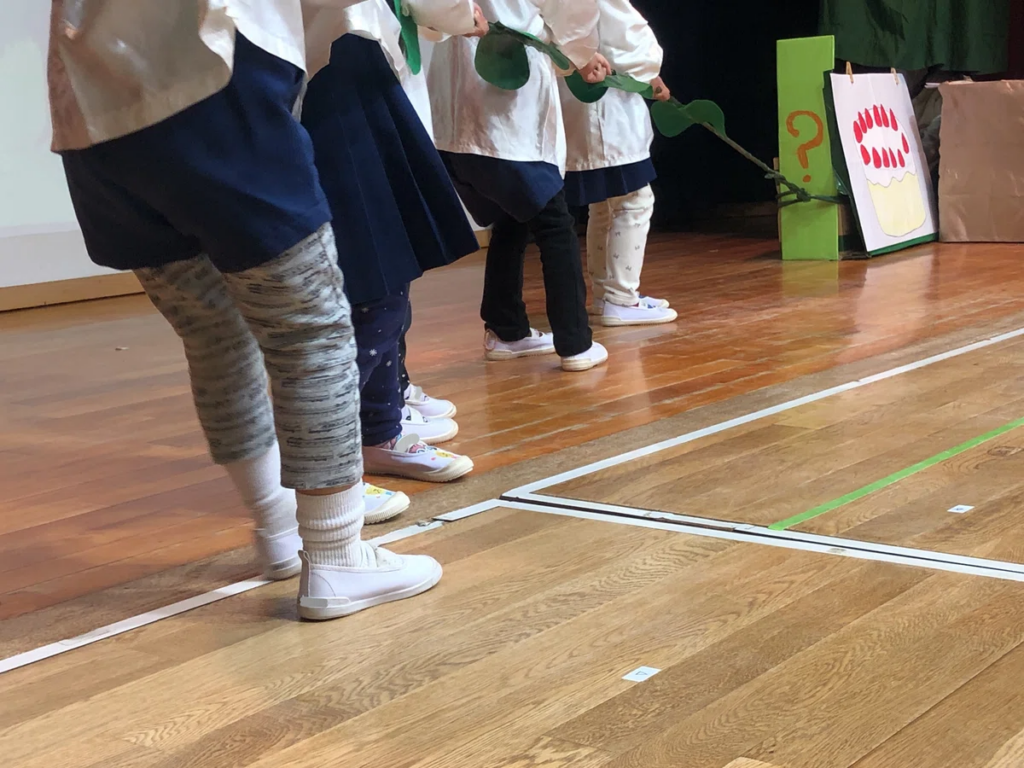 1月23日、年少組の「おゆうぎ会」を開催しました。 初めての大きな行事。幕が開いたときに見られたのは、緊張して固まる姿よりも、いつものようにお友だちと笑い合う子どもたちの姿でした。