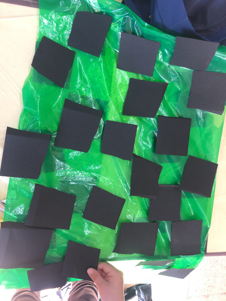 隣では、それぞれの役の衣装づくりも進んでいます。 カラーポリ袋にマジックで模様を描き、形に合わせてはさみで切りながら、 「こんなふうにしたい」 「ここ、いっしょにやろうか?」 と、自分のイメージに没頭する姿や、友だちの作業にそっと手を添える優しいやりとりが生まれていました。