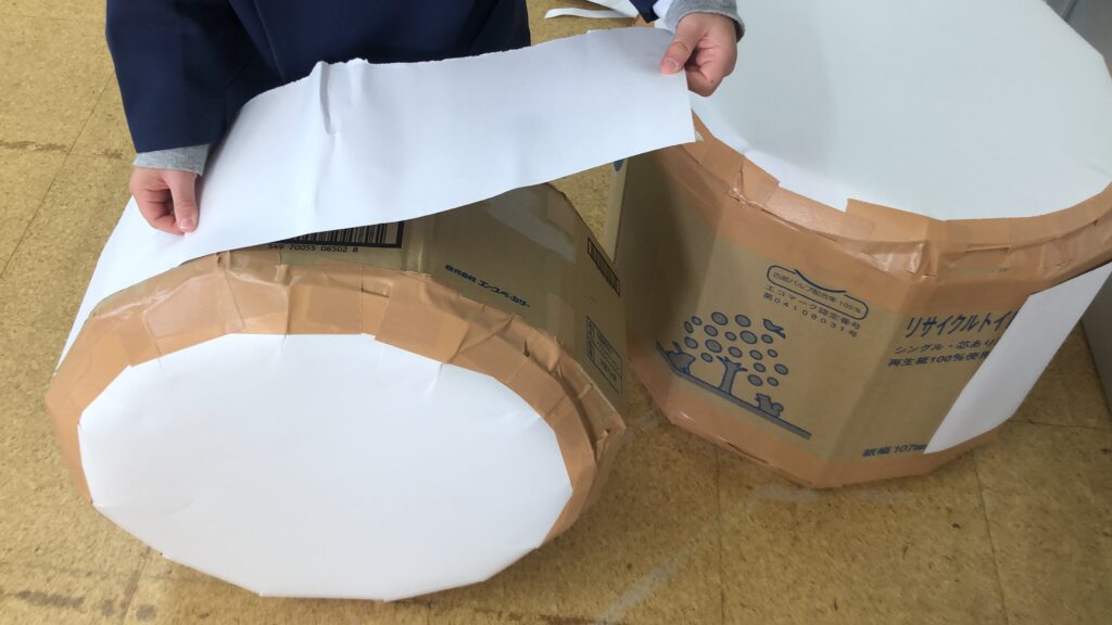 おもてなしの太鼓チームの男の子たちは、バスのお兄さんがダンボールで作ってくれた土台に模造紙を貼り、「ここはこうしよう」と自分たちの手で仕上げていきました。 紙を貼り終えた瞬間、思わず“トントン”…と叩き出す子どもたち。「早く鳴らしてみたい!」という純粋な気持ちが、そのまま真っ直ぐな音になって弾けています。