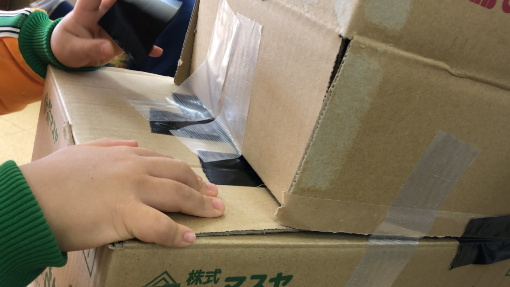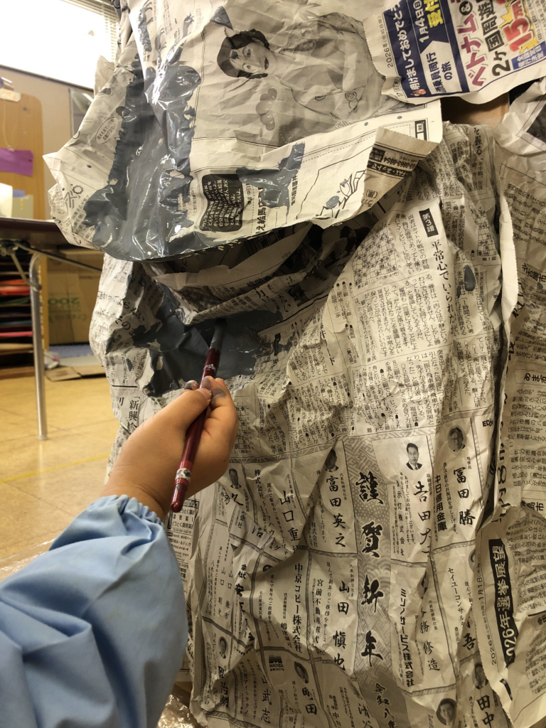 と、子どもたちから箱を少しずらして重ねるアイデアが出てきました。形が決まると、ガムテープでしっかりと固定し、その上から新聞紙を丁寧に貼り、絵の具で色を塗っていきます。見えにくい裏側の部分まで、ぐっと手を伸ばして真剣に筆を動かす姿がありました。