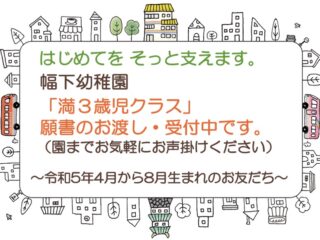 はじめてを、そっと支えます。 幅下幼稚園「満3歳児クラス」 願書のお渡し・受付中です 対象:令和5年4月~8月生まれのお子さま はじめての園生活。ちょっとドキドキ、でも、ちょっと楽しみ。「まだ早いかな」「うちの子、大丈夫 […] - 第2回満3歳児クラス説明会のご案内